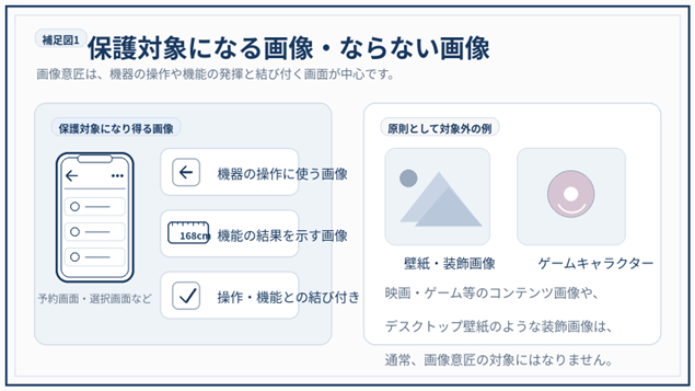 一方で、内容自体の表現を中心として創作された画像や映像、例えば壁紙、ゲーム内キャラクター、撮影された仮想空間の風景画像等は、画像意匠としては認められない例として挙げられています。