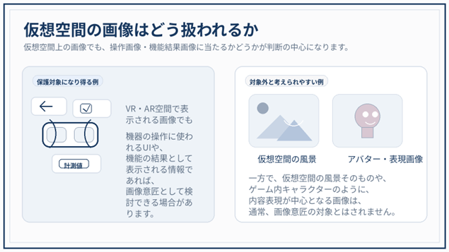 この考え方は、仮想空間において用いられる画像についても基本的に同様です。特許庁のガイドブックでも、仮想空間上の画像であっても、機器の操作画像又は機器の機能の結果として表示される画像に該当するかどうかを基準に判断することが示されています。