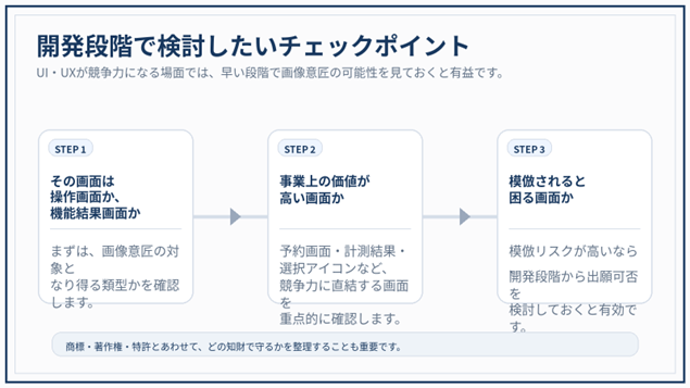 UIやUXが競争力の一部となる現在、開発段階から「この画面は画像意匠として保護できないか」という観点を持つことは、模倣対策や知財戦略の面でも有益といえるでしょう。